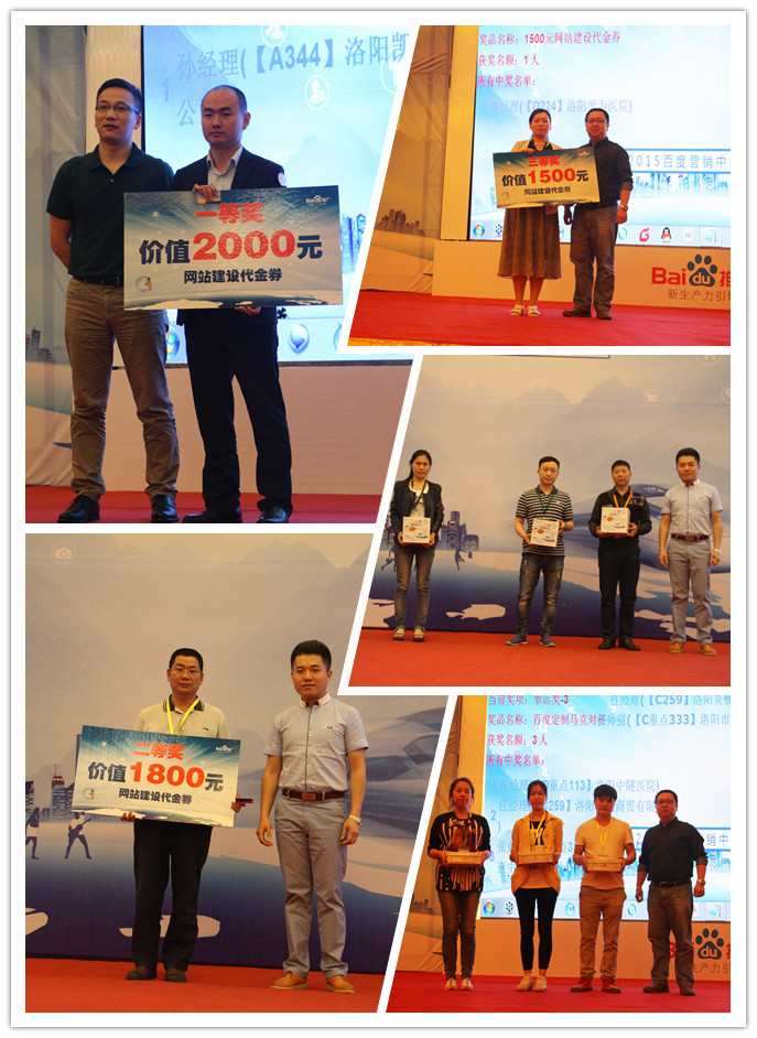 在会议进行当中,我们也设置了幸运抽奖环节,由百度公司渠道部区域总经理董荣华先生,百度公司渠道部区域总监郭晓鹏先生和百度公司市场部区域经理刘方豪先生分别抽取了参会的幸运朋友,同时送上了百度的精美礼品,分别是三等奖价值一千五百元的网站建设代金券、二等奖价值一千八百元的网站建设代金券和一等奖价值两千元的网站建设代金券各一个,更有幸运奖共九名获得百度马克对杯、小熊酸奶机、百度发财熊u盘。